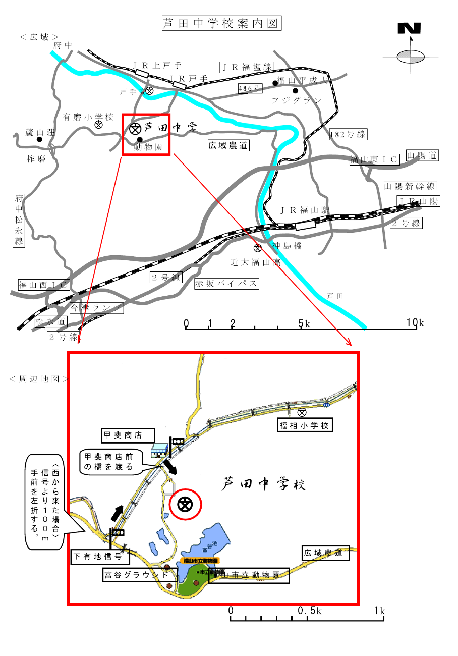 近くに「福山市立動物園」があります。動物園の看板を目当てに学校の近くまでおいでいただけます。