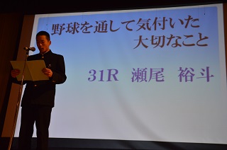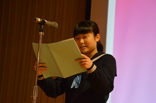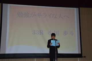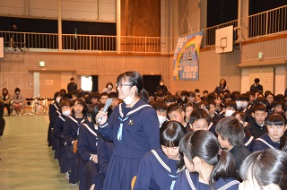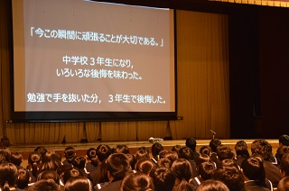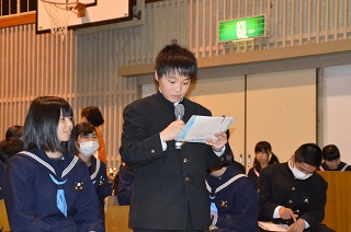 青春メッセージ 平成30年1月21日(水) 21日(水),青春メッセージが行われました。卒業を控えた3年生が自分の経験から,友人や後輩など周囲の人に対しての感謝の言葉や,部活動での経験,進路についてなど,中学校3年間の思いを伝えました。3年生の思いを聞く中で,1・2年生は駅家南中学校の生徒として自分には何ができるかを考えることができました。先輩が作った伝統をしっかりと受け継ぎ,学校を担う覚悟を培ってくれたと思います。
