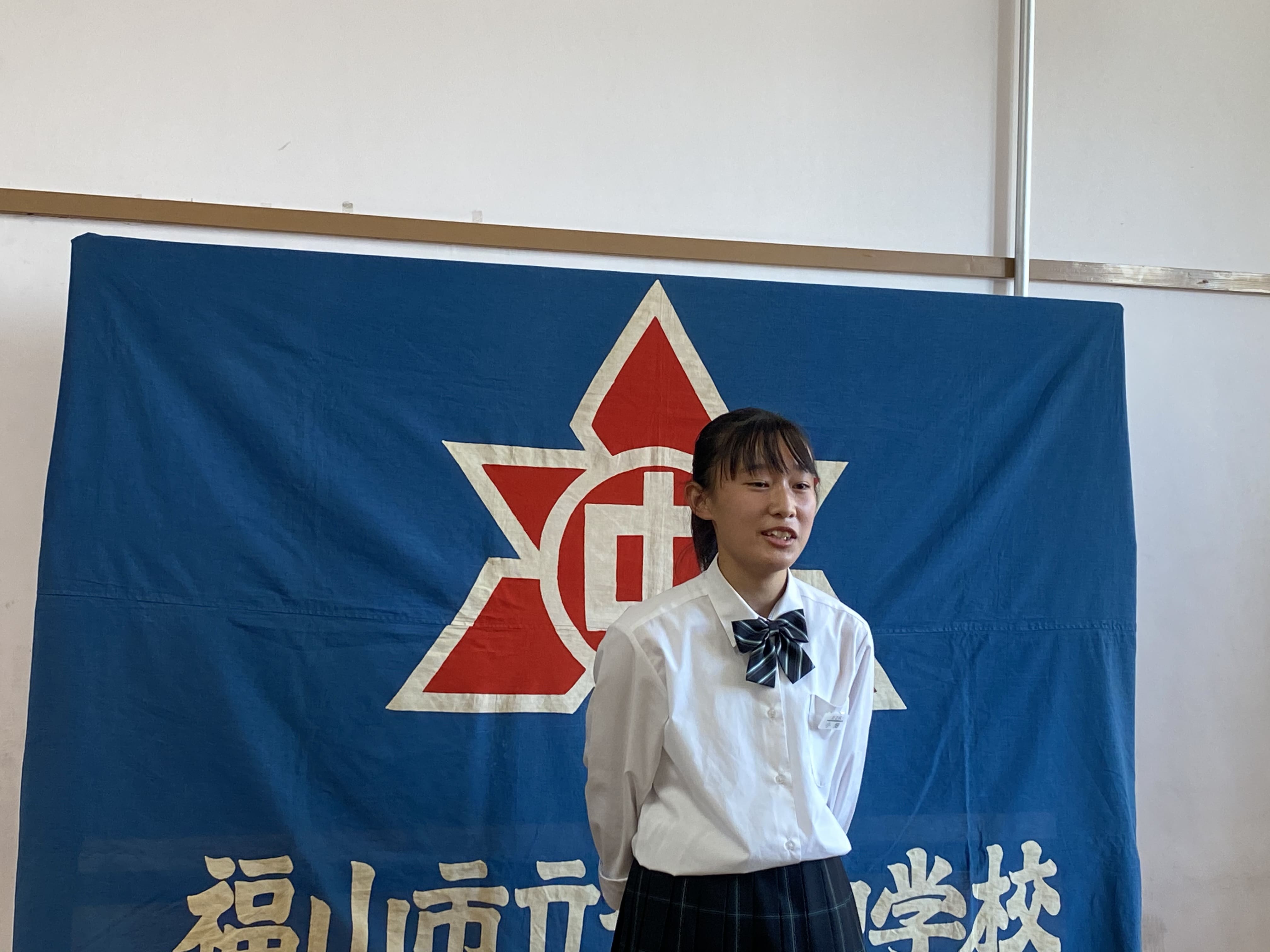 福山市中学校新人総合体育大会の壮行式を行いました。2年生の新部長の生徒が決意を発表しました。