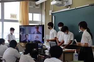 2年生が総合的な学習の時間に取り組んでいる「企業探求プログラム」で、生徒の発表会が行われました。株式会社メニコン、三菱地所株式会社の2社と探求プログラムを作成している株式会社教育と探求社からオンラインで参加していただき、講評をいただきました。