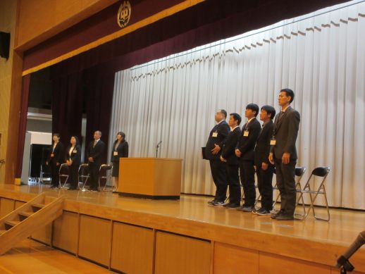| 「活躍動!~ダイナミックアクティビティ~」 春季総体健闘を祈る! 5校時に春季総体に向けて壮行式が行われました。各部活動の代表が、試合に向けた熱い想いを全校に向けて発表しました。初戦突破、県体出場、目標は様々です。ステージで円陣を組んだ男子バスケ部には大きなエールが送られました。 先日行われた交歓大会で好成績を収めたテニス部は、一足先に表彰式です。おめでとうございます! 最後に生徒会会長より、今年度の生徒会スローガンが披露されました。 「活躍動」…素敵な合言葉です。土日の大会では、向中で培った行動力とはつらつさを前面に発揮して,躍動してください! |