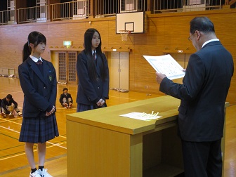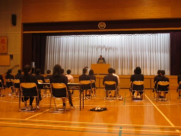 | 「活躍動!~ダイナミックアクティビティ~」 春季総体健闘を祈る! 5校時に春季総体に向けて壮行式が行われました。各部活動の代表が、試合に向けた熱い想いを全校に向けて発表しました。初戦突破、県体出場、目標は様々です。ステージで円陣を組んだ男子バスケ部には大きなエールが送られました。 先日行われた交歓大会で好成績を収めたテニス部は、一足先に表彰式です。おめでとうございます! 最後に生徒会会長より、今年度の生徒会スローガンが披露されました。 「活躍動」…素敵な合言葉です。土日の大会では、向中で培った行動力とはつらつさを前面に発揮して,躍動してください! |