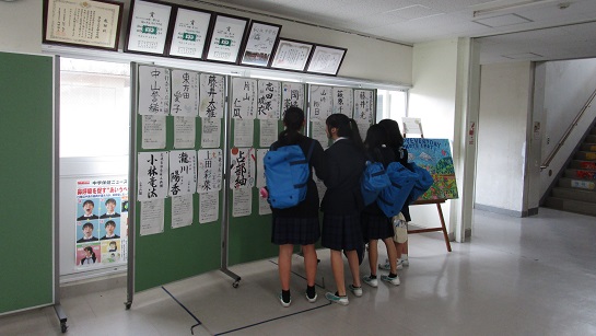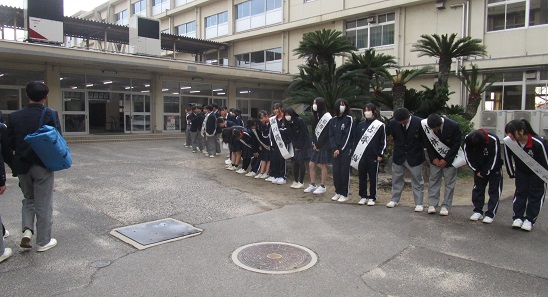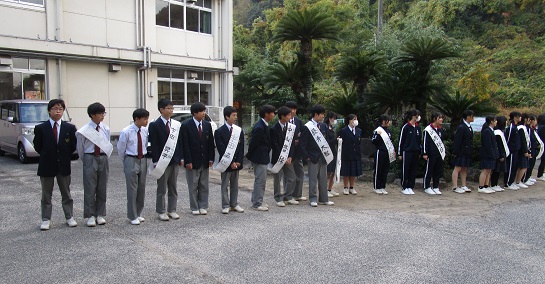 | 投稿30 生徒会選挙に向けて活動が始まりました! 1日(月) 新生徒会に向けて立候補者が出そろいました。本日から手作りのタスキをかけて、朝のあいさつ運動を行いました。そして帰り学活では教室回りを行い、選挙公約を訴えました。公約は各自工夫して個性を出しつつ、それでいて「向中の生活を良くしたい」という共通の願いのもと、全員が立ち上がりました。皆さん、清き一票をよろしくお願いします! |
