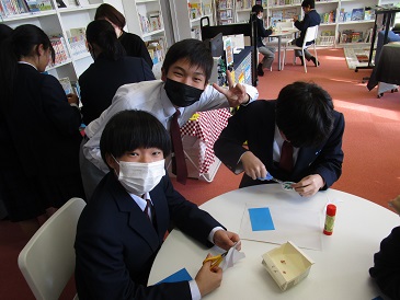 | 合格祈願! 貫通石御守りづくりにチャレンジ。 12/18(水) みなさんは「貫通石」をご存知でしょうか。トンネルを左右から掘り進め、貫通した時に採取された石のことです。「初志貫徹」「難関突破」という意味が込められた貴重な石です。 今年「鞆未来トンネル」が無事貫通しました。その時いただいた貫通石を使って、図書館企画「貫通石御守りづくり」にチャレンジしました。 3年生はもちろん「学業成就」「合格祈願」。1~2年生もいろいろな願いを込めて作成していきます。本のしおりの形にして、最後に貫通石をペタッと貼り付けたら完成です。 困難に打ち克って、己の道を切り拓いていけたらいいですね! |