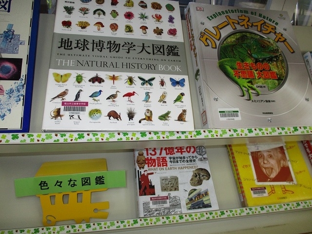 さて,本校図書館は藤井一草先生が毎週水曜日にこられて,本校校務補助員の今井美輝先生と様々なアイディアを出し合い整備されています。アイディアあふれる掲示物や飾り付けなど,生徒みんなが楽しんで本にいそしんでくれるよう工夫されています。そこで ,今回はカープ球団のマスコット「スライリー」に登場していただきました。 みなさん,ぜひ,会いに行ってスライリーおすすめの本を手にとってみて下さい。