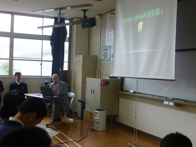 2年生は進路学習会でした。広島県立松永高等学校の温井勝巳先生にお話をしていただきました。「高等学校には,ただ入学をするのではなく,やる気を持って入学して欲しい。そうすれば,3年間がちがいます。」 と話されていました。その後,3年生の代表が3年間頑張ってきたことや高校入試に向けての話をしました。