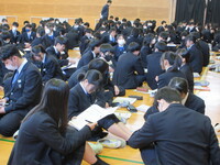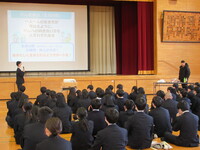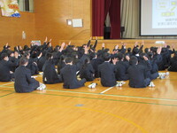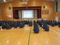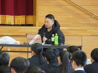 2月9日、学校薬剤師の土屋先生をお招きし、がん教育の講演を実施しました。講演では、がんという病気の正しい知識だけでなく、生活習慣と健康の関係、早期発見の大切さ、そして命の尊さについて学ぶことができました。生徒たちは真剣な表情で話を聞き、メモを取る姿や、自分や家族の健康について考える様子が見られました。今回の学びを通して、日頃の生活を見直し、生徒の健康増進に役立つことを願っています。
