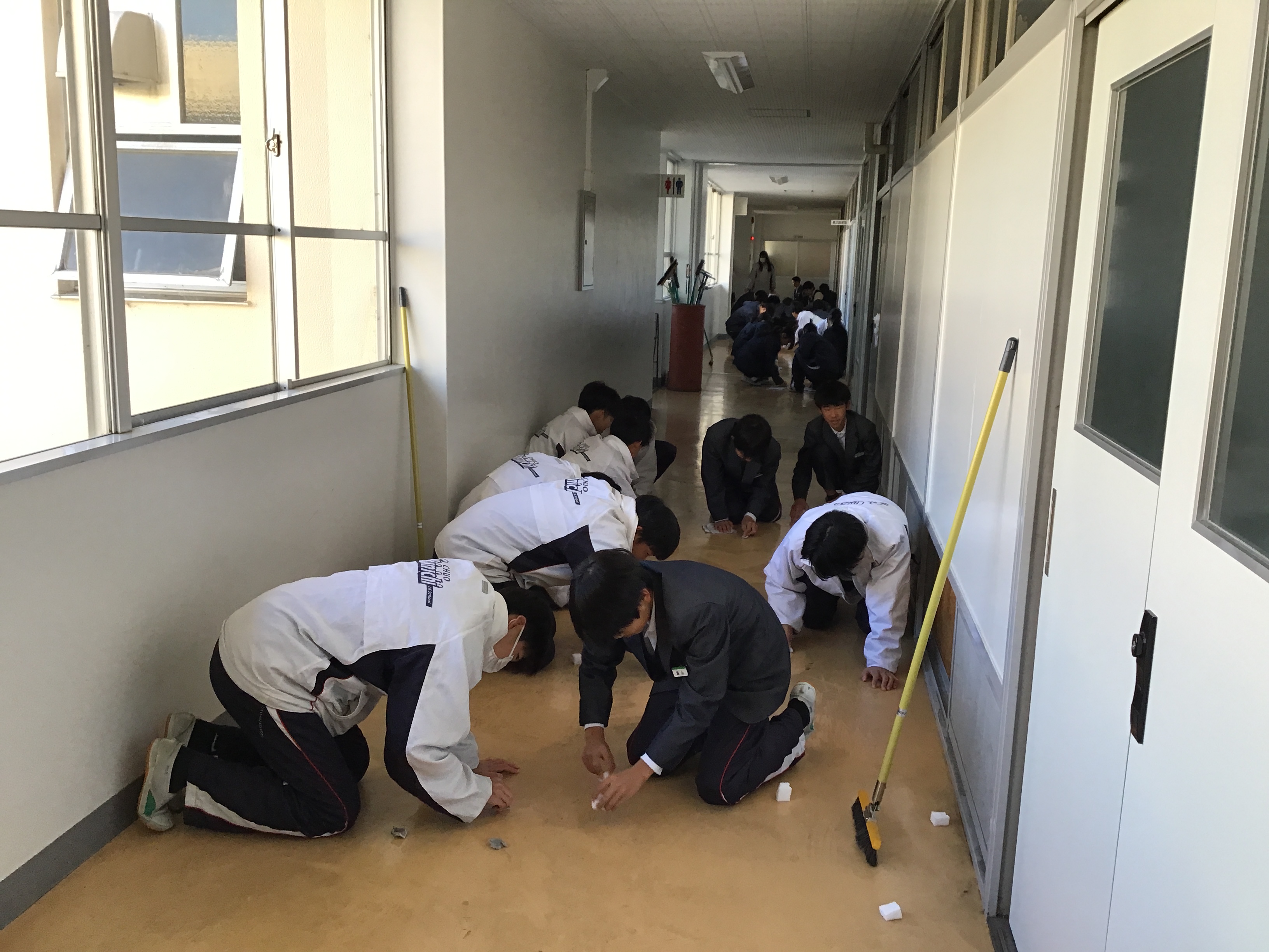 多くの生徒が朝早く登校し、教室前の廊下の汚れ落としに取り組みました。