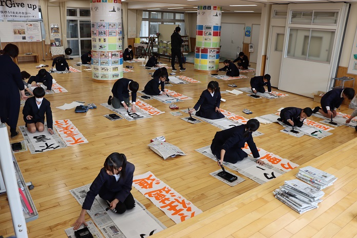 6年生が、自分で6年間の学んだことや成長したことを振り返り決めた四字熟語を長半紙に大きな筆で書く「修了の書」を行いました。