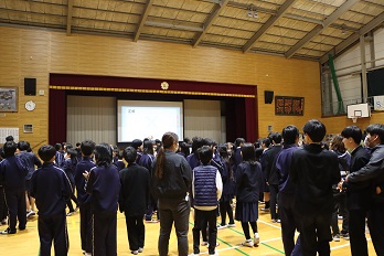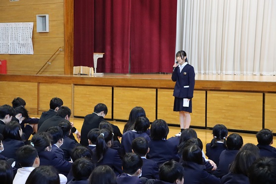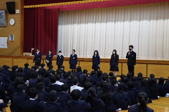 学園会からは、代表生徒より「今年度最後の学期、1日1日を大切に過ごし、9年生は仲間との思い出を作って充実した3学期にしていきましょう。」と話しました。