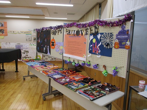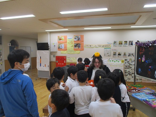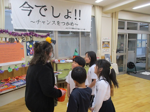 ALTがハロウィンイベントを開催しました!子どもたちはALTに「トリック・オア・トリート!」と言い、ボックスからくじをひきます!