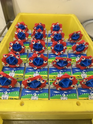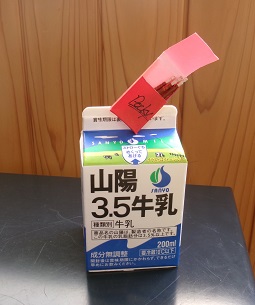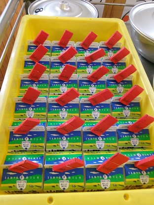 牛乳ケースの中で並んでいる牛乳にかわいいランドセルがついていました。子供たちも大喜び!
