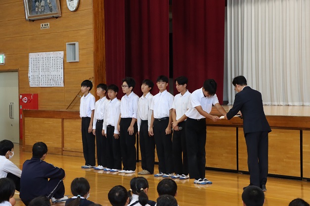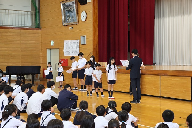 また、「バラを描こう」作品展入賞や野球部による「福山地区中学校ミニ新人戦野球大会」3位の表彰も行いました。様々な場所で力を発揮している様子が全校児童生徒に伝わり刺激になりました!