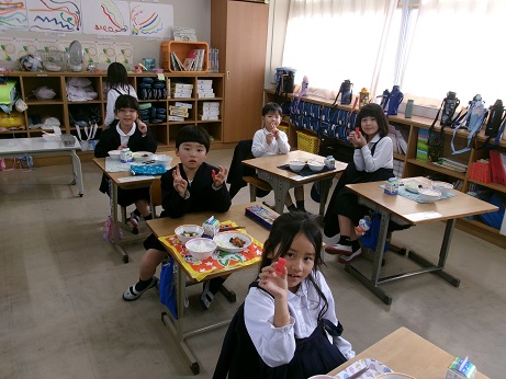 このランドセルは,給食の先生から1年生へのプレゼントでした。一つ一つ折り紙で手作りしてくださり,1年生のみんなに給食を楽しくたくさん食べて大きくなってほしいという思いが込められていました。この日のメニューはカレーライスとコーンサラダ,牛乳でした。カレーライスもあっという間に完食し牛乳も喜んで飲んでいました。