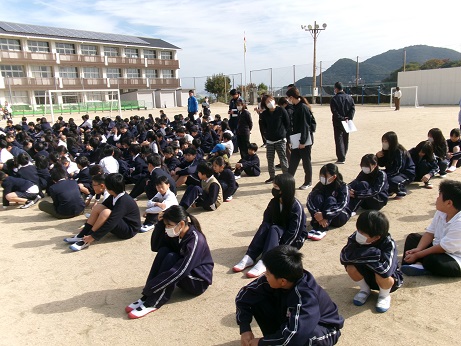 聞いている児童も、いつもとは違う9年生先生の話を真剣に聞いていました。
