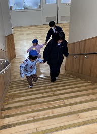 8・9年生は、こども園の子と手をつなぎ誘導しました。優しいお兄さん・お姉さんに園児は安心していました!