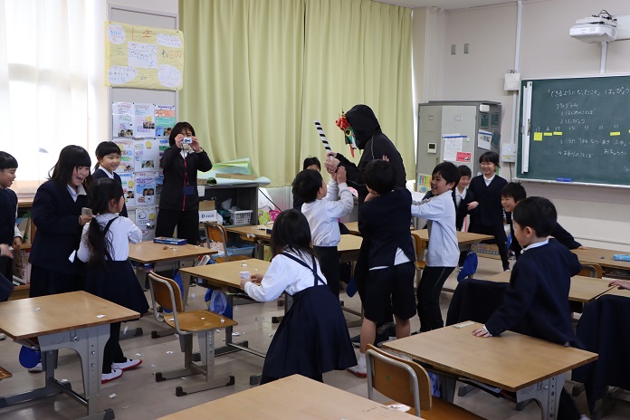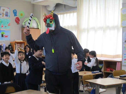 生活科の時間に勉強していたら、まずはかわいい鬼が…。みんなでワイワイと豆を投げて退治!