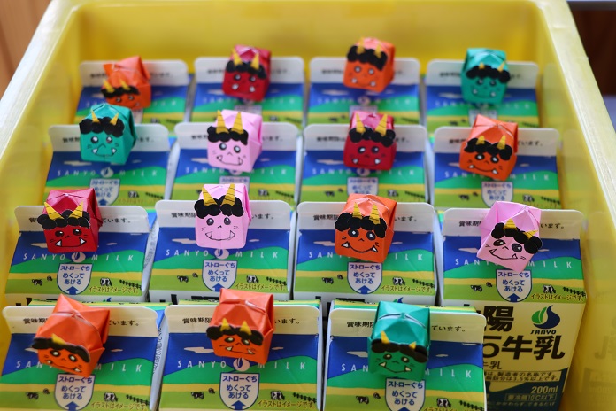 給食では、毎月恒例の給食の先生からの折り紙のプレゼントがありました。そこには、鬼がついていました。