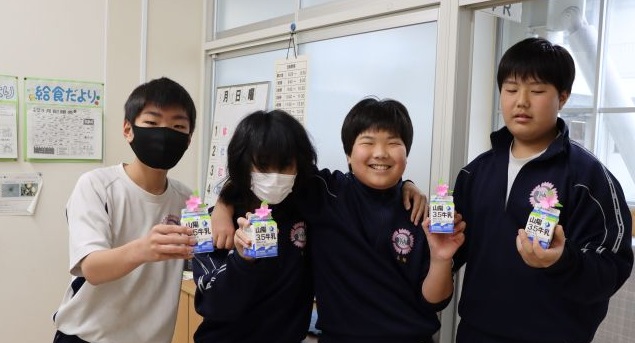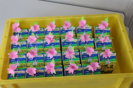 今日の給食の時、牛乳には満開の桜が咲きました!