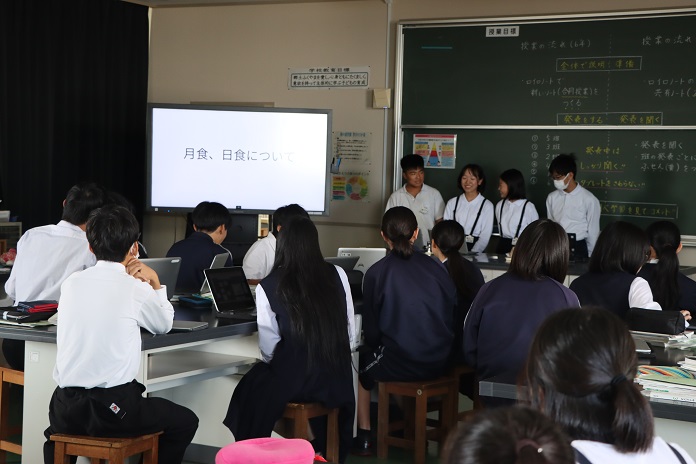 6年生は月の動き方・形について分かったことや学んだことを9年生にスライドにまとめて発表会しました。9年生は感想に6年生に伝えました。
