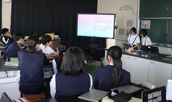 3時間目の理科の時間に、6年生が学習したことを9年生に発表しました。同じ時期に学習内容を合わせ、学年を超えた学びになりました。