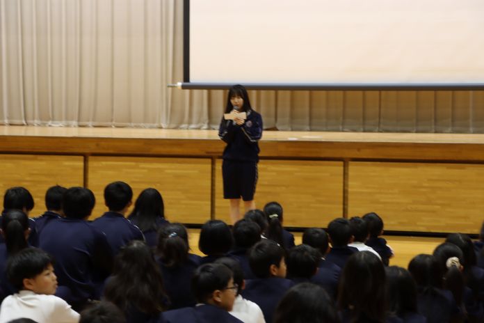 今日の学園朝会では、学園会から、学園のみんなが幸せな学校生活が送れるためのきまりである“幸せの道”について説明しました。