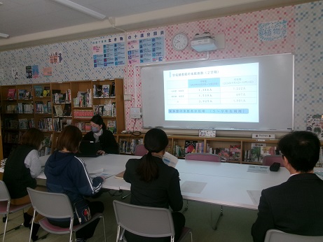 授業で利用状況や図書室来館者数・貸出冊数などについての報告し、読書活動を工夫し、早期の読書習慣の形成を大切にしていくことを共有しました。