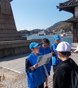 アメリカからのクルーズ船が鞆に寄港し,9年生たちは常夜灯・旧太田家住宅・対潮楼・渡船場・沼名前神社の5か所に分かれ,訪れた観光客に英語でガイドをしました。出発前に何度もガイド文を練習し,自信を持って学校を出発しました。グループに分かれそれぞれの持ち場に着くと,生徒たちは「Hello!」と挨拶をして観光客とコミュニケーションを取り始めました。