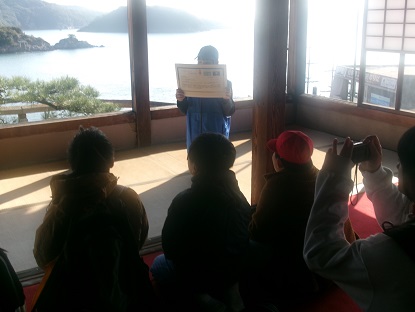 A cruise ship from the U.S. arrived at Tomo, and the 9th graders were divided into five groups and gave English guided tours to visitors at five different locations: a nightlight, the former Ota residence, the taityoro, the ferry terminal, and the Nunakuma Shrine.