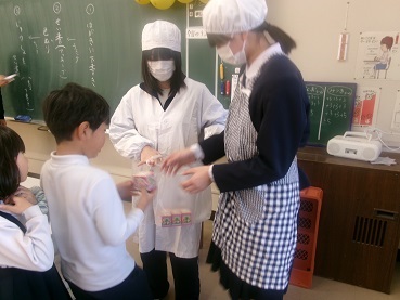 そして1・2年生は、お祝いケーキを給食委員から手渡しで配ってもらい、給食サンタっからのプレゼントに大喜びでした。