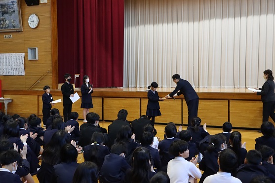 2学期に取り組んだ作文や俳句、絵画等の表彰式を行い、それぞれの頑張りに拍手を送りました!