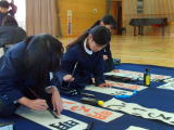 | 4年生かきぞめ | 1月14日,児玉恒風先生を講師として4年生が書き初めをしました。上手に書くポイントを教えてもらいながら,長半紙に「明るい心」を書きました。児童の作品は,1月19日(月)から2月6日(金)まで「あびき交流館」,「ふれあいプラザ」「JAあびき」「網引郵便局」の4か所に分かれて展示されています。 |