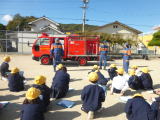 | 消防団の方による授業がありました。 | 11月19日3年生の社会科「火事からくらしをまもる」の授業で,消防団の方に来ていただき,消防のことについて学びました。防火衣の試着や消防車の装備について説明を聞くなどしました。 | ![]() |