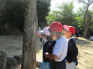 1年生は待ちに待った「あきみつけ」に出発しました。赤坂小学校を出発し、近くの神社へあきのものを見つけに行きました。落ち葉や木の枝・どんぐりに松ぼっくりと、たくさんの秋を発見することができました。