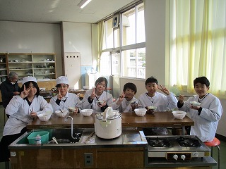 家庭科の時間に、総合的な学習の時間で育てたお米を使って調理をしました。お米の学習でお世話になった地域の方をお招きして、炊いたご飯を一緒にいただきました。