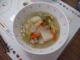 2月10日(火)の献立には5年1組2班が考えた「栄養たっぷりみそ汁」が登場しました。かつお節でだしを取り、具材にベーコン、じゃがいも、だいこん、たまねぎ、にんじん、えのきだけ、ねぎを入れ、白みそで味付けしました。かつお節のだしと白みそでやさしい味わいのおいしいみそ汁になりました。このみそ汁のアピールポイントは「旬の野菜が入っていて、栄養がある(赤・緑・黄の食べ物がそろっている。)たくさんの種類の具材が入っていてワクワクする!」です。次のオリジナルみそ汁も楽しみです。