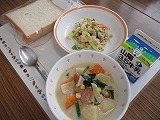 3月12日(木)の給食は、今年度のひろしま給食に選ばれた「広島ほうれんミソ・ミルクシチュー」でした。これは、広島市立五日市東小学校の6年生の児童が考えたレシピを給食用にアレンジしています。 みそ風味のシチューに、広島県でも栽培されているじゃがいもやほうれん草と旬の野菜を使っているので、色合いがよく、具沢山で、しっかり栄養をとることができます。ひろしま給食で、地元の食べ物について興味をもってもらえればと思います。3月分の食育だよりにもレシピを掲載していますのでご家庭でも作ってみてください。