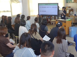 6月6日(金)の午後、校内研修で救命救急講習を行いました。AEDを使っての実技研修を行うと同時に、本年度は、緊急を要する傷病の手当の必要性や、緊急時運搬法、異物除去法について学びました。
