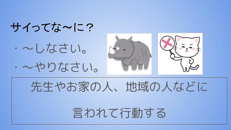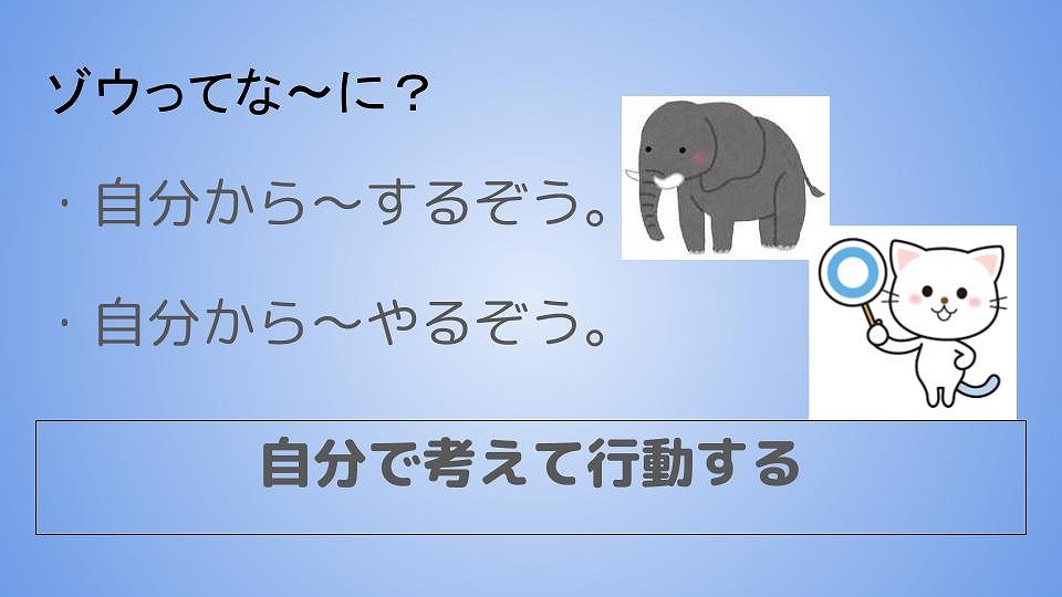 また,多くの人が「〜しなさい」「〜やりなさい」と言われて行動していると思いますが、それだけでは十分ではありません。大切なのは、自分から「〜するぞう」「〜やるぞう」と自分で考えて行動できるようになることです。サイからぞうに変身したみなさんを楽しみに待っています!