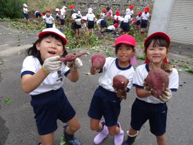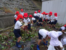 2025.10.21 たくさんとれたよ! 1年生がいもほりをしました。今年はサツマイモがたくさんの葉を大きく広げていたのでたくさんとれるだろうと予想はしていたのですが、予想以上に大きなサツマイモがたくさんとれました。大喜びの顔をたくさん見ることができました。 |