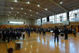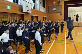 | 2025.12.17 体を動かしながら音楽を 2学期最後の音楽朝会を行いました。朝はかなり冷え込んできたので、音楽クラブの子どもたちと先生たちとで打楽器隊を編成して、そのリズムに合わせて体を動かしながら全校で歌を歌いました。朝の体育館に大きな歌声が響きました。 |