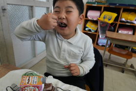 | 2025.9.22 思わず笑顔に 本年度になって初めて、「ココア牛乳のもと」が給食に出ました。子どもたちは「甘くておいしいから好き!」なんだそうで、いただきますの前からうれしそうに茶色のチューブをながめていました。「私はね半分牛乳に入れて、半分はパンに付けるの」。食べ方もいろいろです。 |