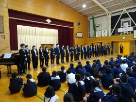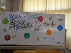 | 2025.12.19 音楽に親しむ大休憩 音楽クラブの子どもたちが大休憩に「年越しコンサート」を開いてくれました。会場の音楽室には次々に子どもたちや先生たちが集まるなか、ベートーベン「喜びの歌」の合奏を披露してくれました。年末を感じる、素敵な手づくりのコンサートでした。 |