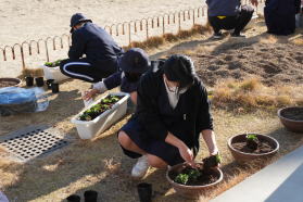 | 2026.1.9 花いっぱいの卒業式に 環境委員会の子どもたちがビオラの苗をプランターに植えました。2ヶ月後に行われる卒業式や4月の入学式が華やかになるように今から準備しているのです。これから大切に育てていきます。 |