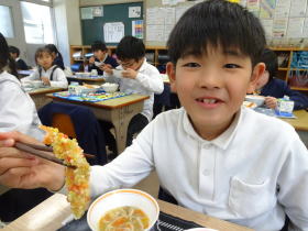 | 2025.12.18 クリスマス献立 今日の給食は子どもたちが楽しみにしていた「クリスマス献立」。チョコレートケーキにとりのから揚げ、コンソメジュリアンというメニュー。「今日の給食にケーキが出る」と子どもたちは朝から笑顔でしたが、配られたケーキを前にさらに笑顔がふえました。 |