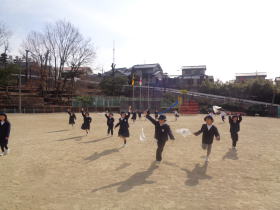 | 2026.1.16 凧あげ 1年生が運動場で手づくりの凧をあげて遊びました。風が少ない日だったのですが、子どもたちは凧をあげようと笑顔で元気に走りながら楽しんでいました。 |