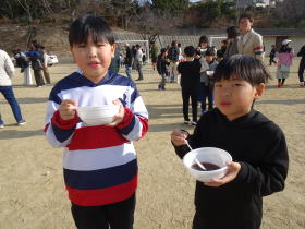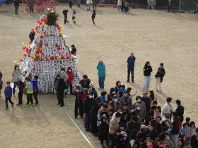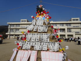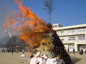 | 2026.1.18 とんど祭り 今年で4回目となる学区とんど祭りが小学校運動場で行われました。年々参加者数が増えており、今年は6年生の呼びかけもあって子どもたちの姿をたくさん見ることができました。高く燃え上がる炎から新しい年の活力をもらったようです。 |