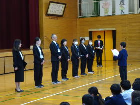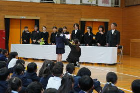 | 2026.2.3 児童会役員交代. 6年生が務めた後期児童会役員とこのたび選ばれた5年生前期児童会役員との引継ぎ式を行いました。6年生役員全員がこの半年を振り返っての感想を述べてくれましたが、みんなとても堂々としており感心させられました。5年生役員のこれからの活躍にも期待が高まります。 |