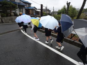 | 2026.4.10 1年生 初めて登校班で登校しました 今朝は雨が降る中、1年生にとって初めてランドセルを背負い、傘をさしての登校で大変でした。班長さんをはじめ、班のみんなで1年生の歩幅に合わせてゆっくり歩き、安全に連れてきてくれました。 |