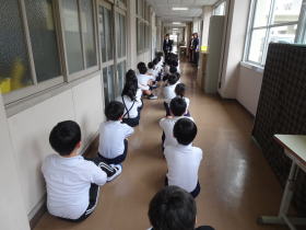 | 2025.11.10 上に逃げる 土砂災害を想定した避難訓練を行いました。火事などでは広い運動場に避難しますが、土砂災害は1階部分が危険なため校舎の上の階に避難します。状況に応じてどこに避難すればよいのか考えて行動する力もとても大切ですね。 |